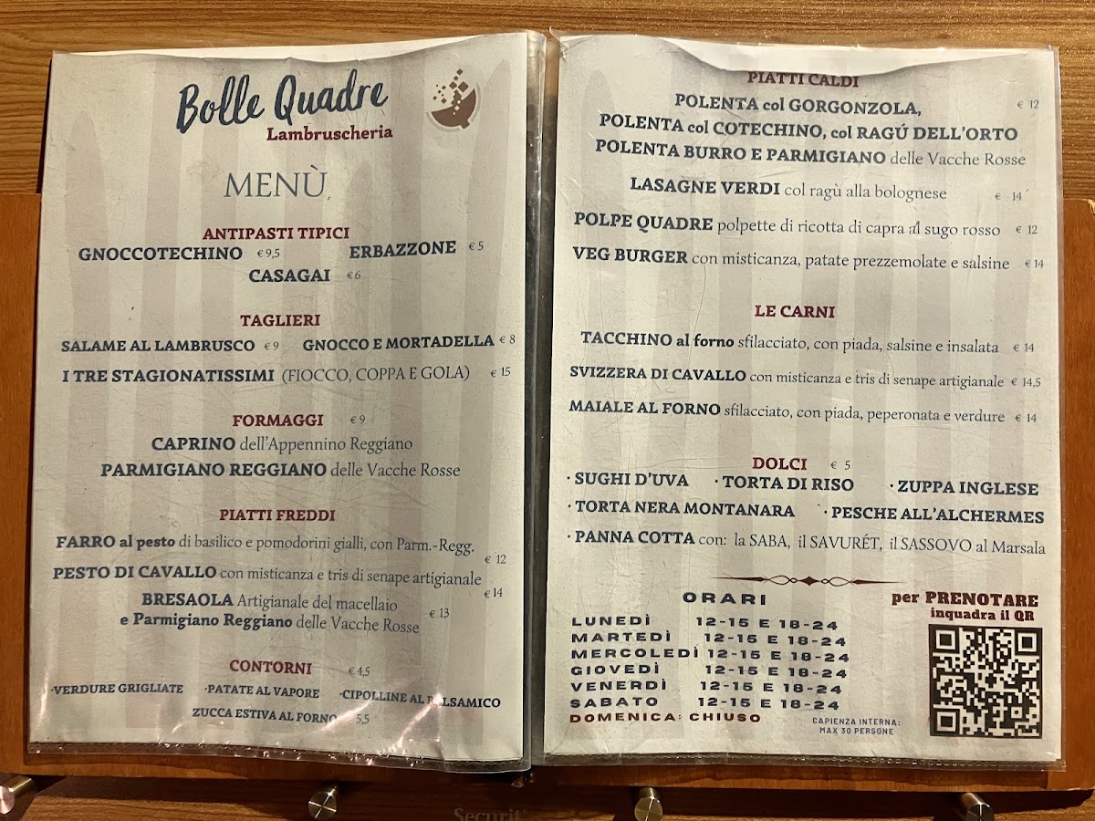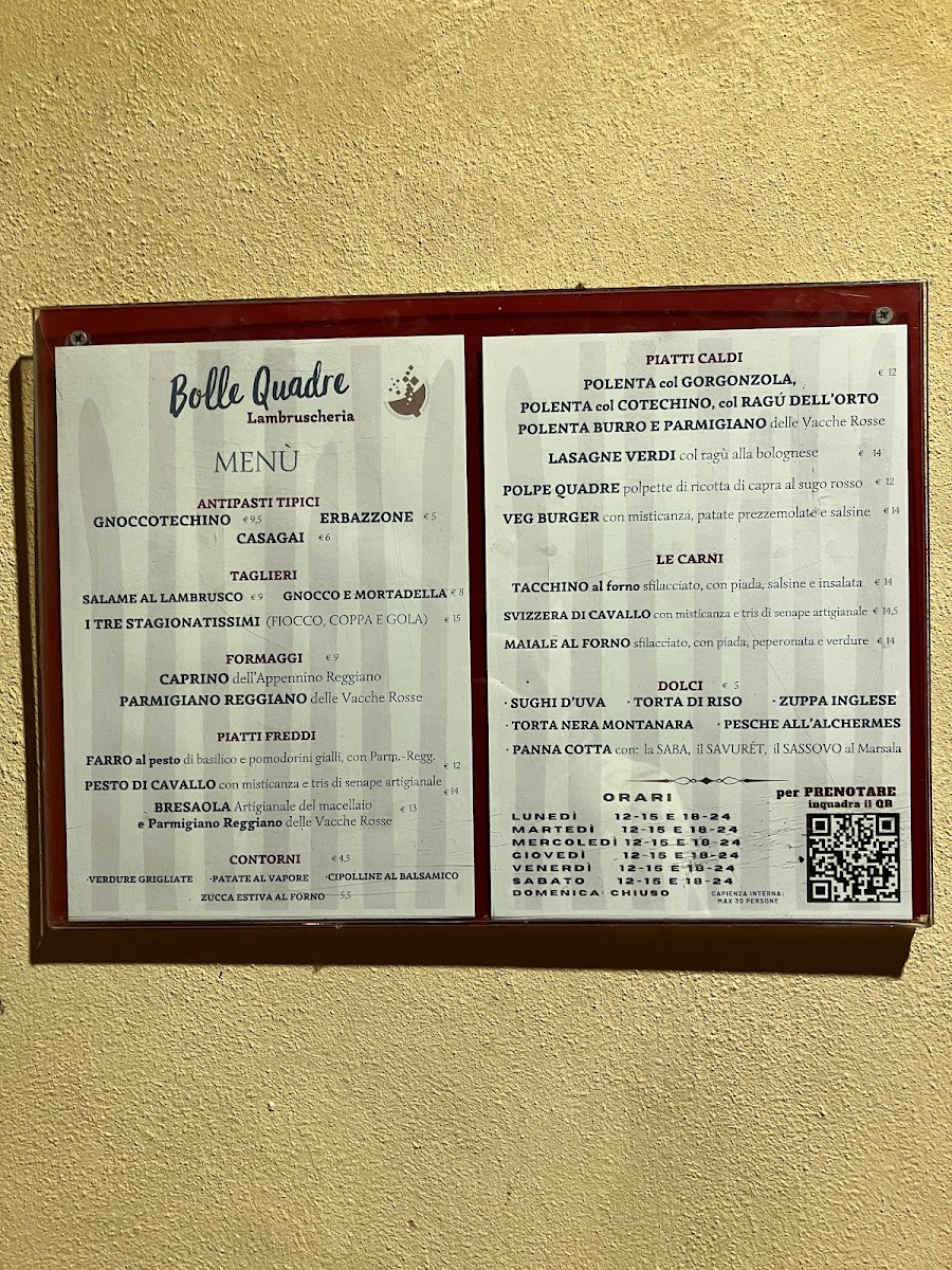 Introducing the menu at Bolle Quadre Lambruscheria, nestled in the heart of Reggio Emilia, promises an enchanting culinary experience. This charming restaurant reflects the rich flavors of Italian cuisine, emphasizing local ingredients and traditional recipes. Patrons rave about the gnocho con Cotechino, hailed as a standout dish, while the panna cotta and lasagne are crafted with evident love and expertise.